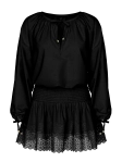 Характеристики:    •    Суміш бавовни та льону    •    Декоративний виріз «краплинка» спереду    •    Зборка (смокінг) на талії    •    Зав’язка на горловині спереду    •    Зав’язки на рукавах    •    Легко одягається через голову    •    Квіткове мереживо    •    Декоративні вирізи    •    Ручне прання    •    Імпорт